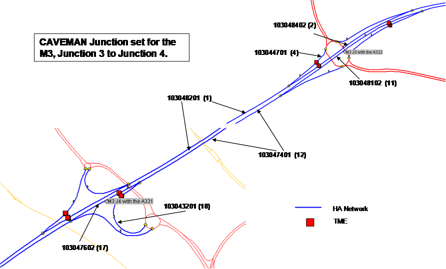 Link 103047401 is a member of the validation link set for the M3, junctions 3 to 4 as shown in Figure 3. This figure shows the Project Network link identifiers and their equivalent Link position numbers in the CAVEMAN validation template for a grade-separated junction shown in Figure 1.