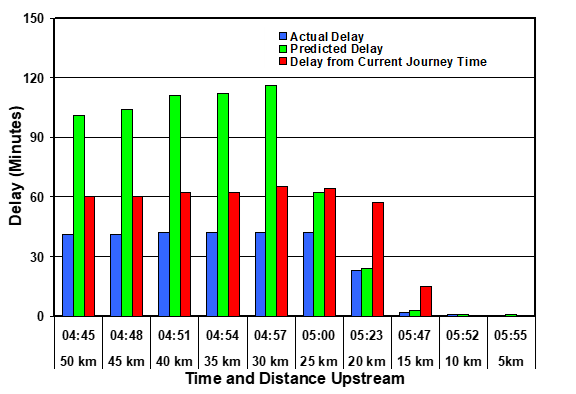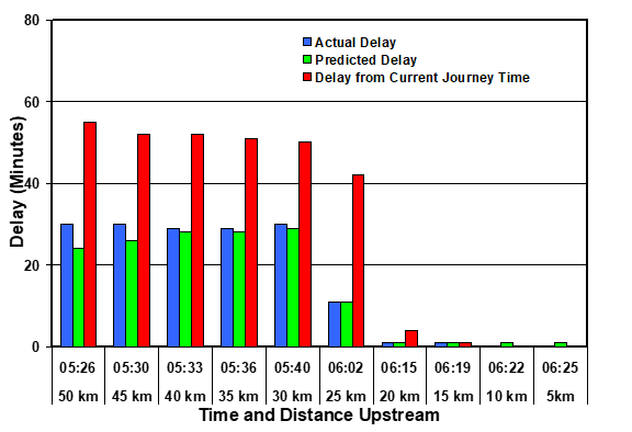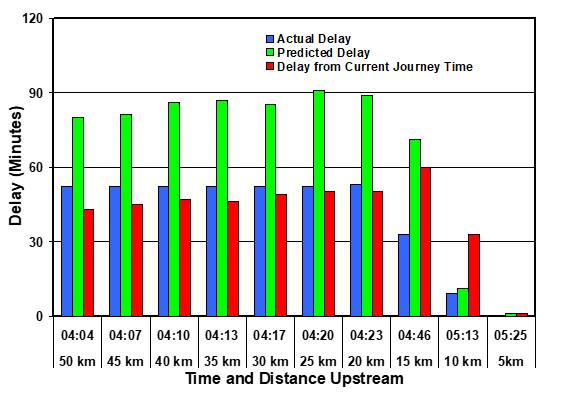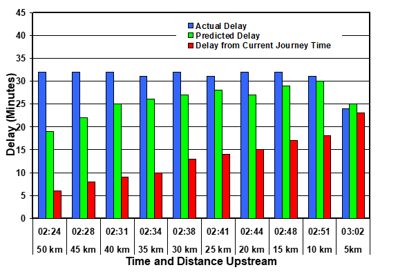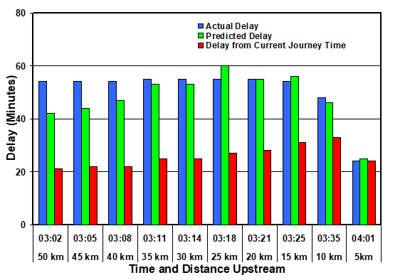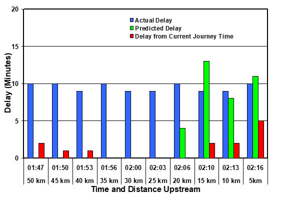 Figure 1 shows the situation for drivers who reached the final monitoring site at 02:30 (00:00 represents the starting of the time-recording clock). The blue bars indicate the delay that was actually experienced between the upstream monitoring site and the final monitoring site. These were, of course entirely unpredictable prior to 02:00, the time at which the blockage occurred. However, by 02:05, while the drivers were still more than 20km upstream, a delay would have been generated by the methodology of Equation 2 indicating a delay 20km away. By 02:10, when the drivers were 15 km upstream, the delay would have been fully predicted (actually somewhat over-predicted). Thereafter the predictions would have been very accurate. If, instead of using Equation 2, the latest journey time information had been used to predict the delay, it would have been triggered late and would have seriously under-estimated the delay.